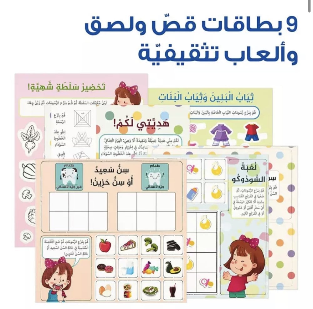بطاقات فك وتركيب وألعاب تثقيفية: لعبة سودوكو /تلوين الفواكه والخضروات / تحضير سلطة شهية / حان وقت الرياضة / ثياب للبنين وثياب للبنات / وقت تنظيف الأسنان / لعبة التصنيف "سن سعيد وسن حزين!" / القضاء على الجراثيم الشريرة /مجسم الهرم الغذائي.